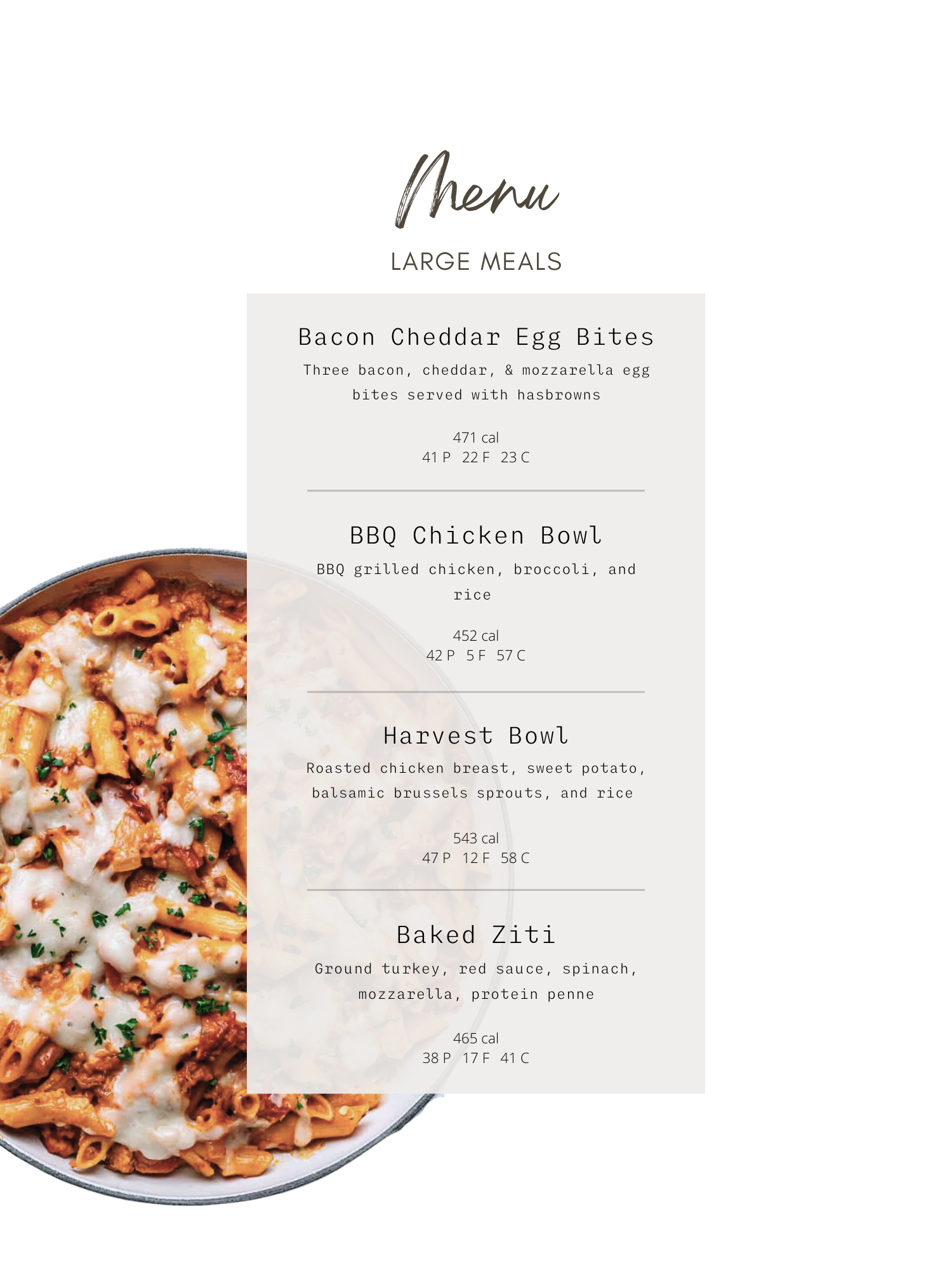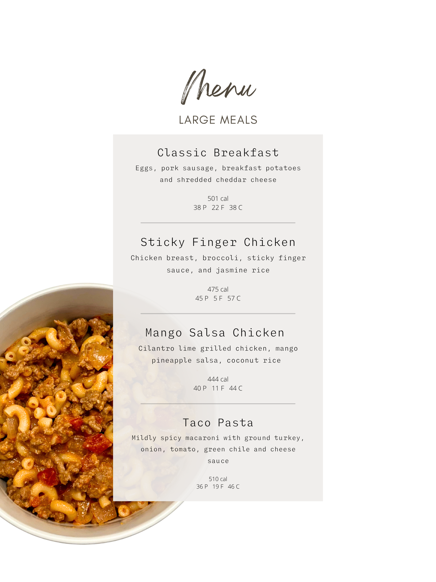Check out our current weekly menu posted every Wednesday morning. Select a meal package, subscription, or custom order. Orders must be placed by Friday at midnight.